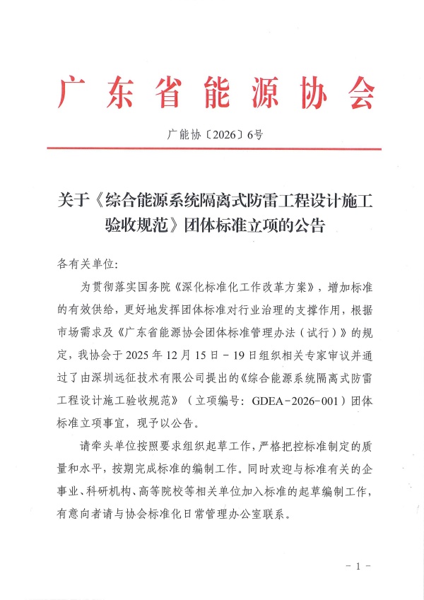关于《综合能源系统隔离式防雷工程设计施工验收规范》团体标准立项的公告