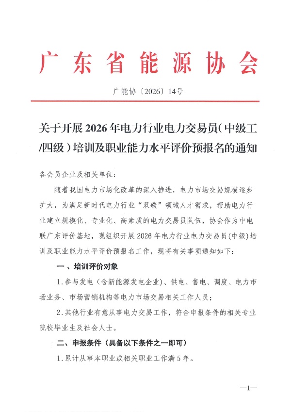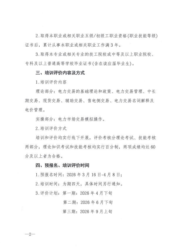 关于开展2026年电力行业电力交易员(中级工四级)培训及职业能力水平评价预报名的通知