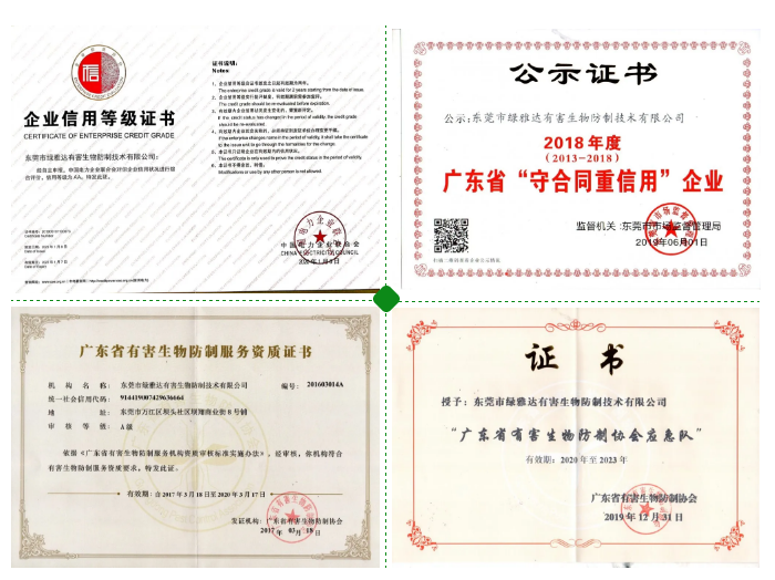 获得广东省有害生物防制A级服务资质证、广州市卫生协会甲级服务资质、广东省白蚁学会A 级服务资质,2019 年被认定为广东省高新技术企业。