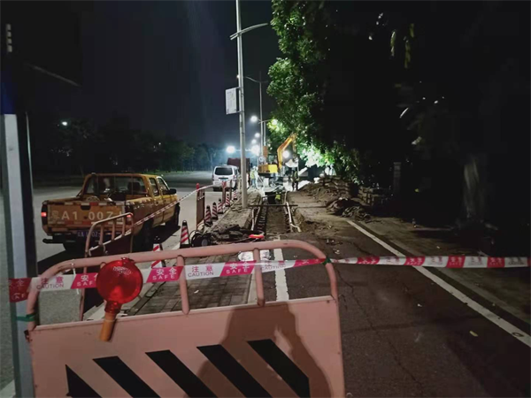 争分夺秒,攻坚克难。随着南沙疫情防控措施的加强,区政府发布了交通管制通告,在规定时间人员车辆只进不出。在如此艰苦的环境下,国企党员冲锋在前,继续争分夺秒在二十多公里线路寻找故障点,并成功定位故障点后,发现电缆本体外半导电层存在多处严重烧蚀痕迹。为保障线路日后安全稳定运行,决定扩大故障相电缆的更换范围至200米处,并在13个点进行三相电缆本体开窗检查、两处开展X光检测。明确抢修方案后,穗杰电力积极组织协同,土建、安装人员有序迅速开展土建开挖、电缆敷设、附件安装等工作。为争取时间,现场人员两班轮换,昼夜奋战,累了在车上、车旁、草地上席地而睡,醒来后又投入新的战斗。