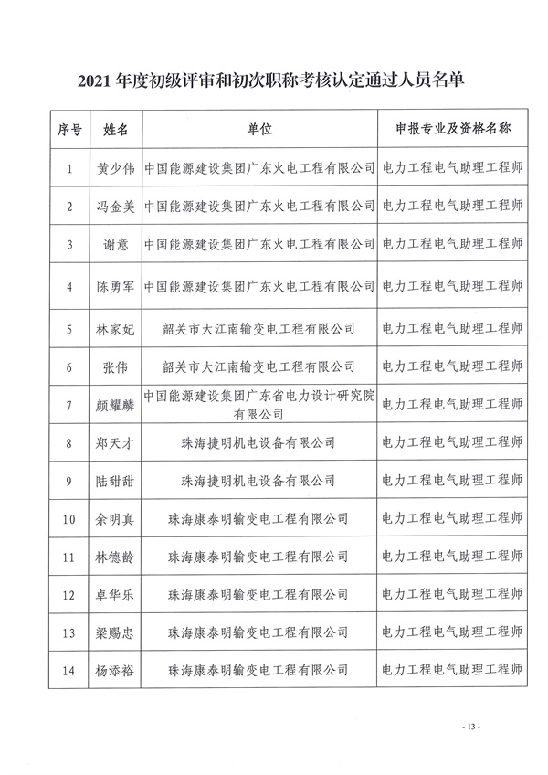关于2021年度广东省电力工程技术工程师资格第二评审委员会评审和初次职称考核认定通过人员公示的通知