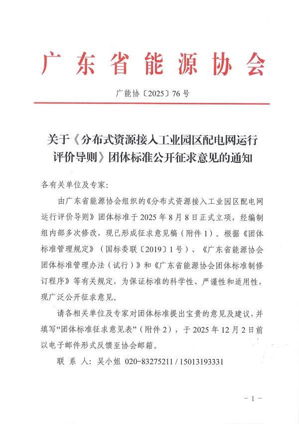 关于《分布式资源接入工业园区配电网运行评价导则》团体标准公开征求意见的通知